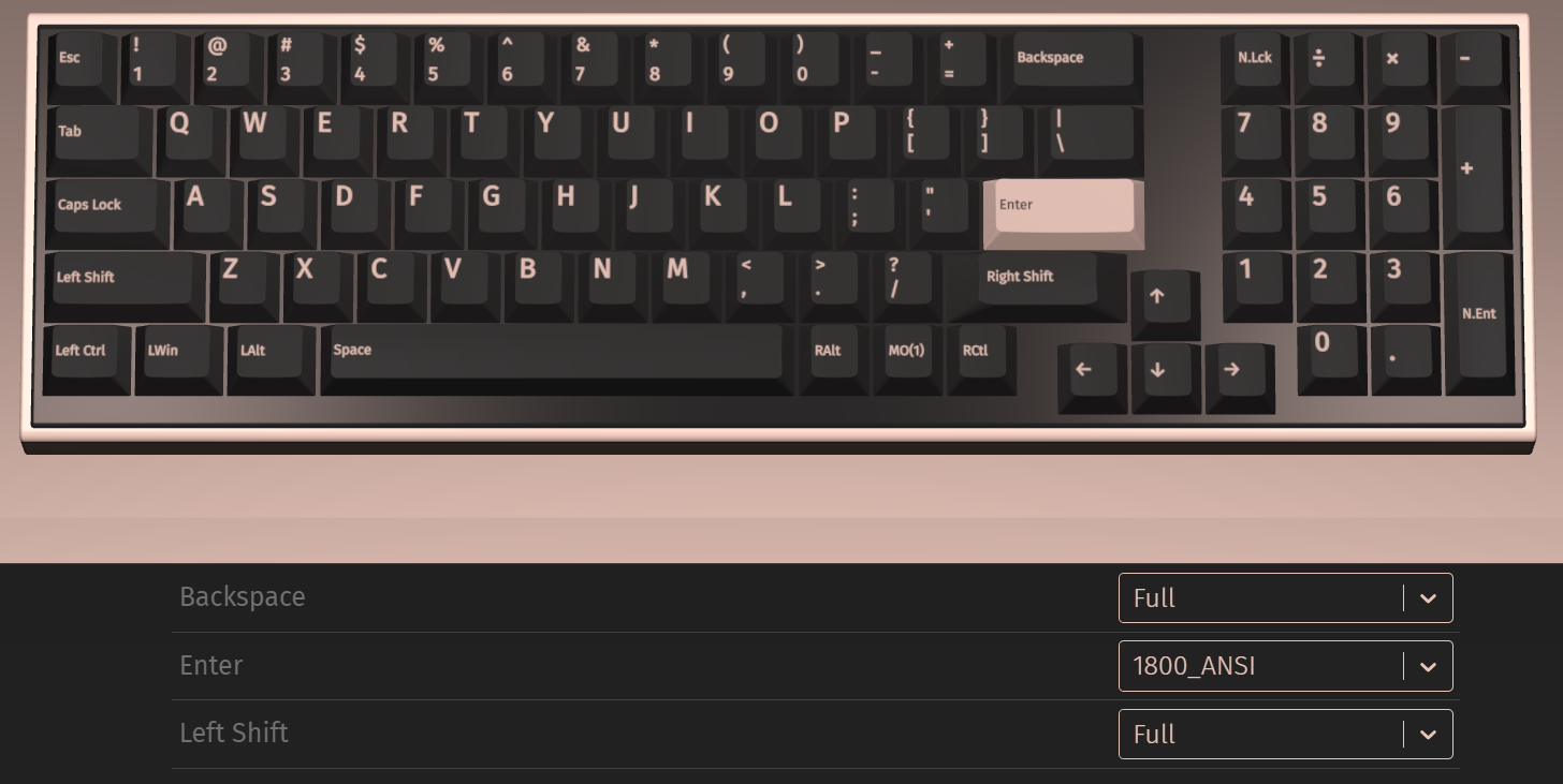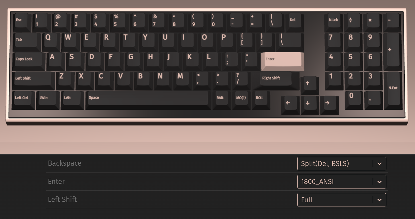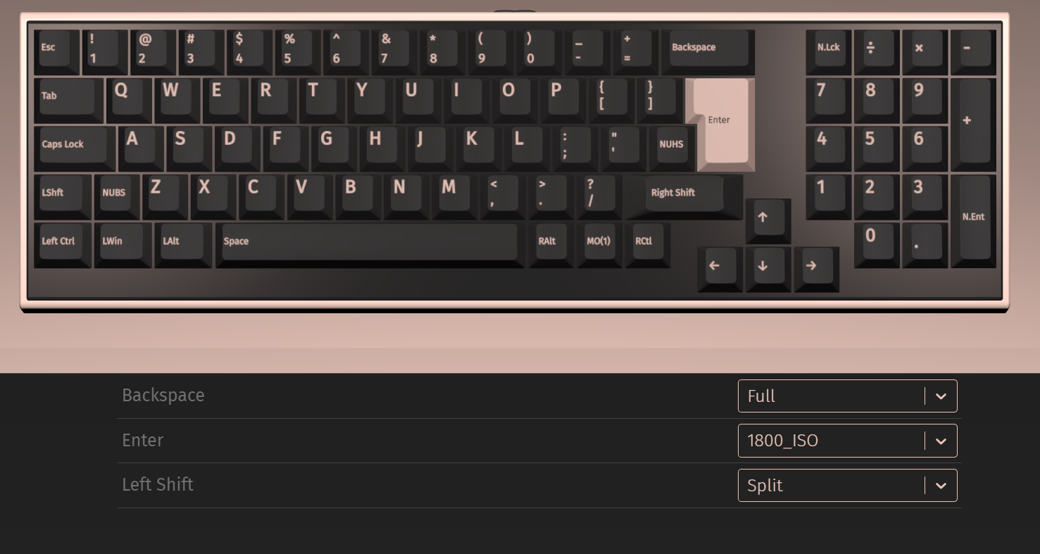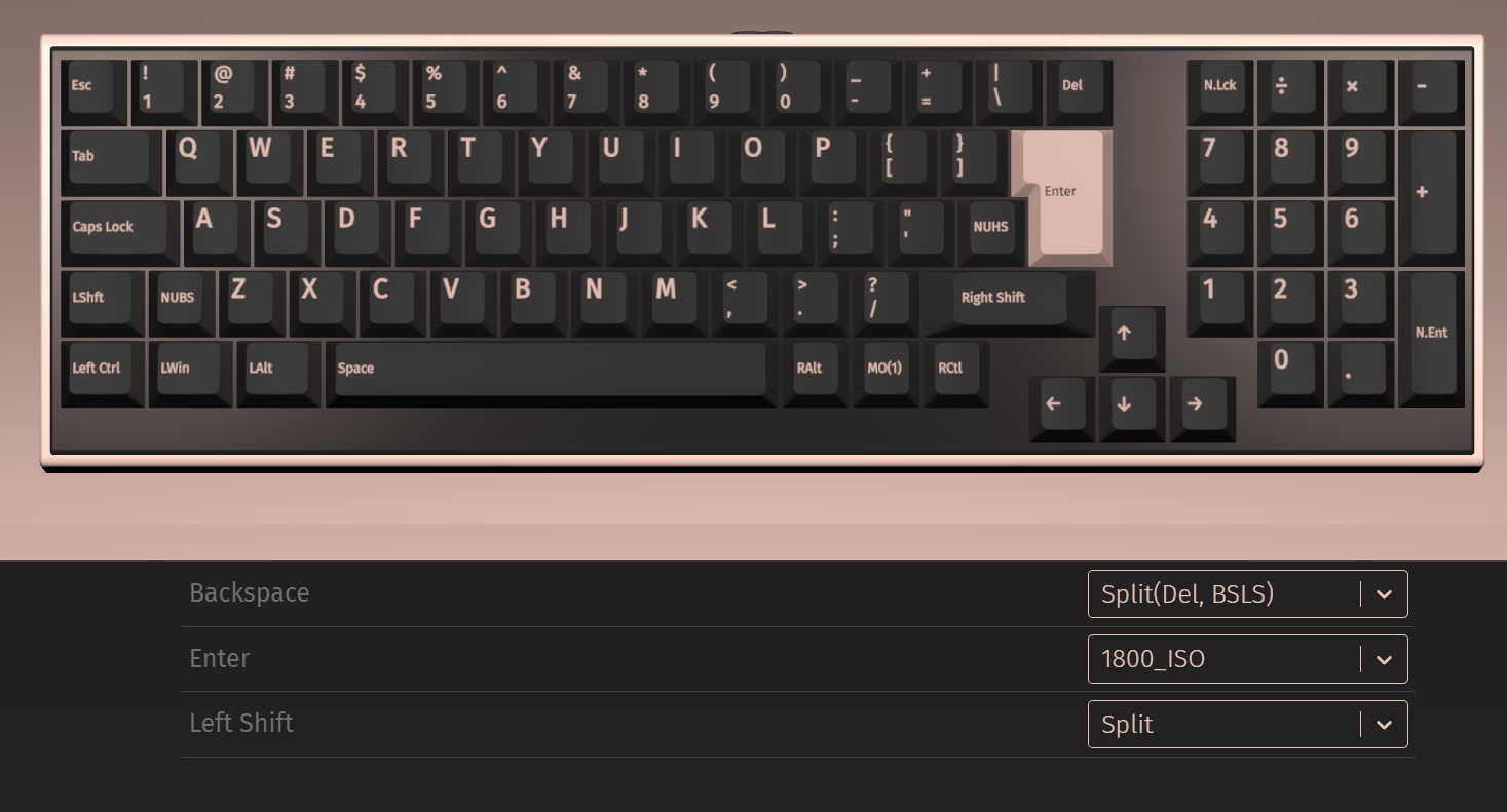 If you want to change the configuration (1800/US/EU/split Bksp and split left Shift), please switch the configuration through the second "layout" icon in the lower left of the VIA interface