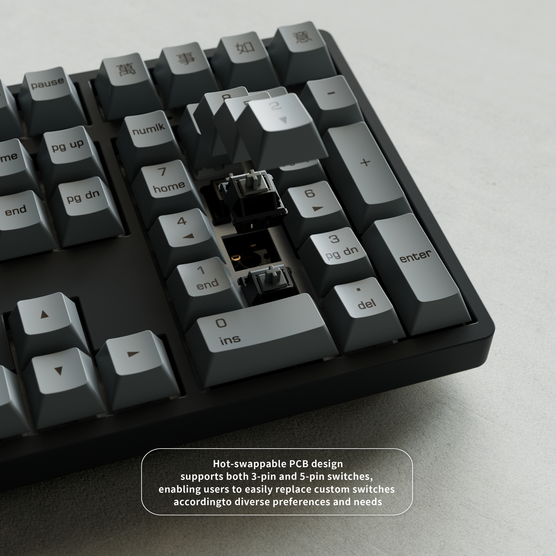 Hot-swappable PCB design(PCB thickness : 1.6mm) supports both 3-pin and 5-pin switches, enabling users to easily replace custom switches according to diverse preferences and needs