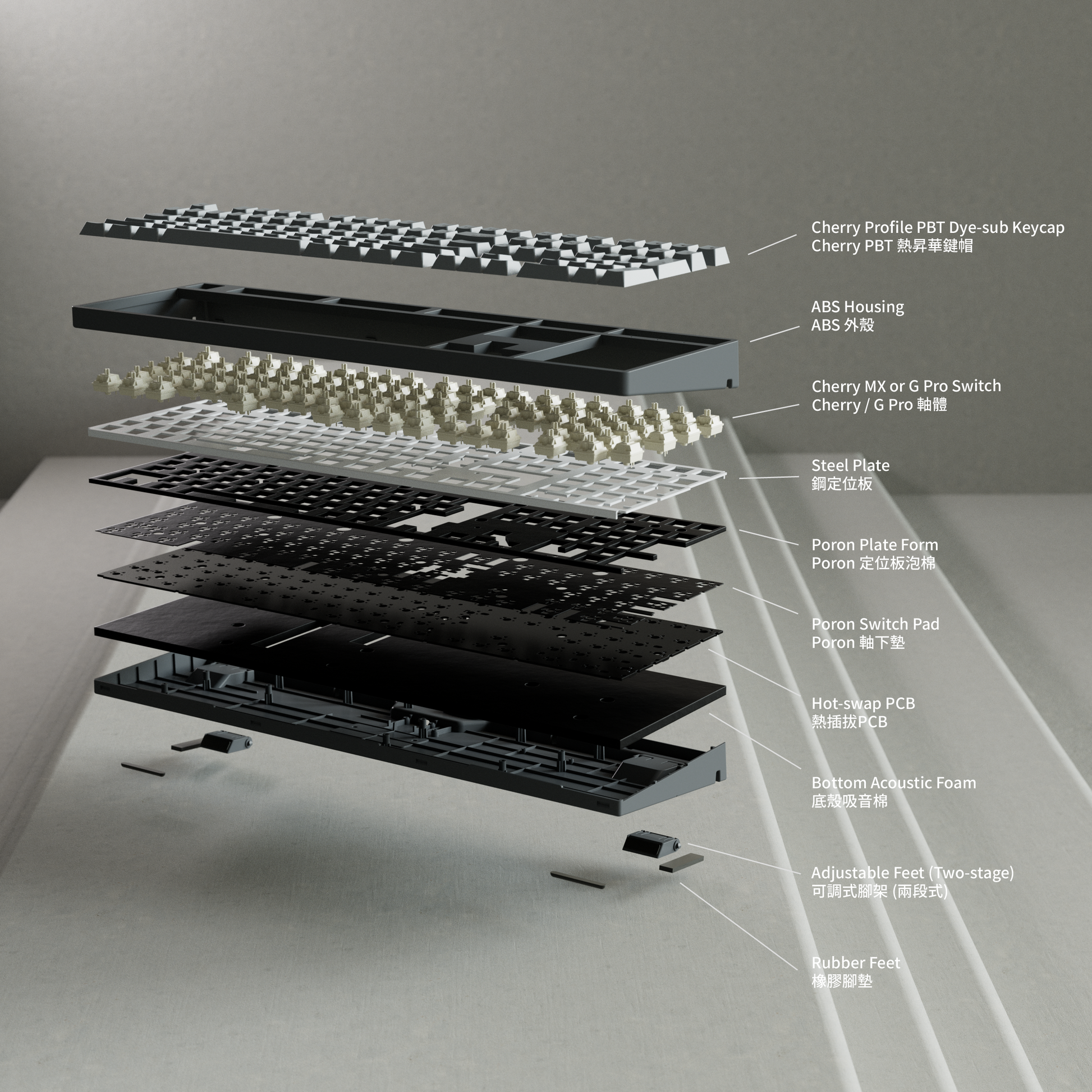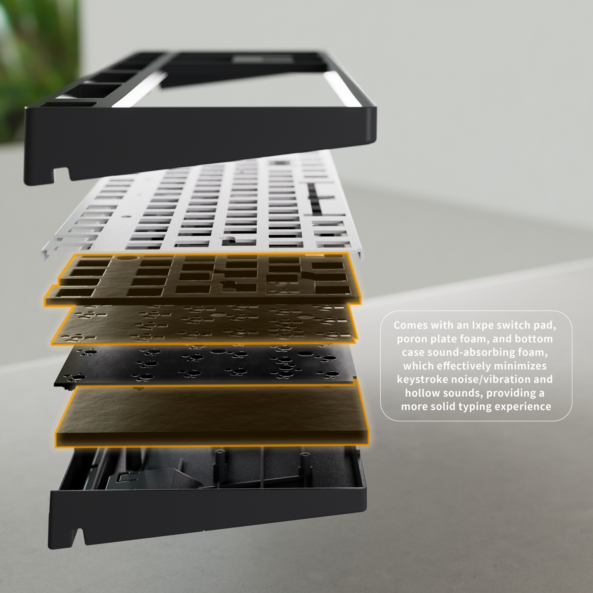 Comes with an Ixpe switch pad, poron plate foam, and bottom case sound-absorbing foam, which effectively minimizes keystroke noise/vibration and hollow sounds, providing a more solid typing experience