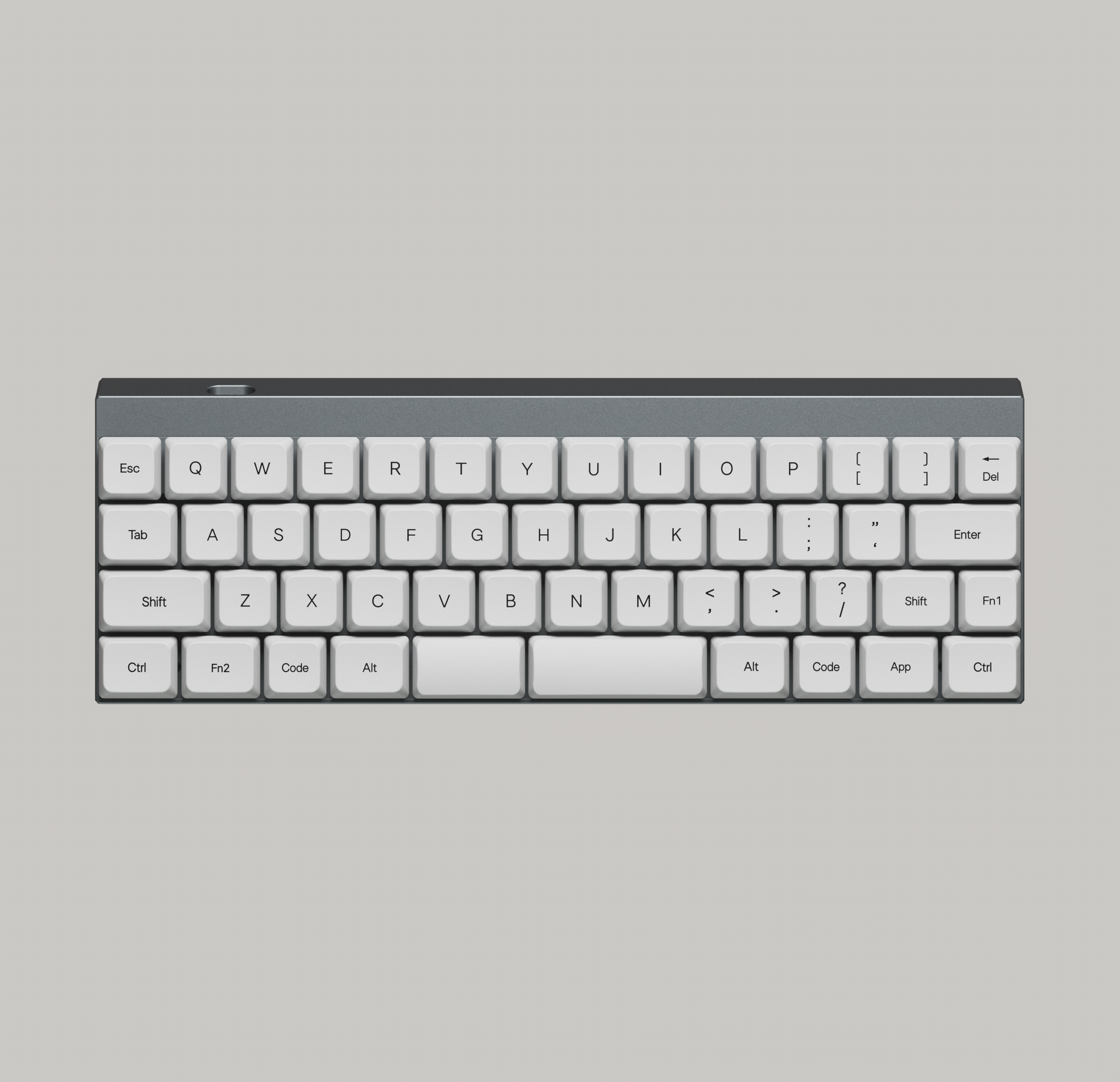 50 keys in total, the layout comes with 2 spacebars and 2 Fn keys by default.