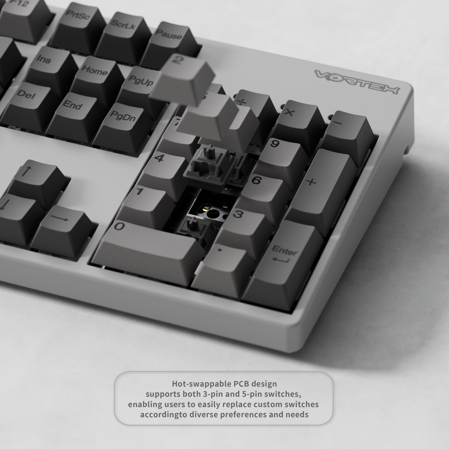 Hot-swappable PCB design(PCB thickness : 1.6mm) supports both 3-pin and 5-pin switches, enabling users to easily replace custom switches according to diverse preferences and needs